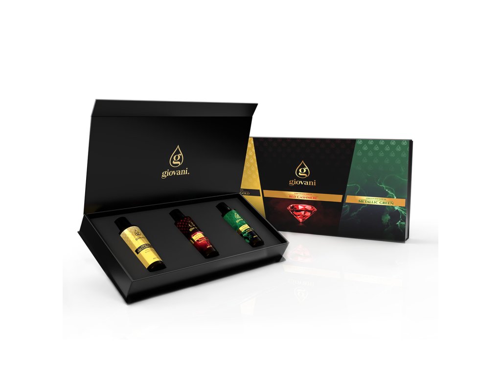 Verwen je dierbaren met het meest geurige wasparfum op de markt, verpakt in een prachtig gemaakte cadeaudoos. Zo’n luxueus cadeau zal iedereen blij maken en meteen verrassen. Zodra de doos wordt geopend, volgt nog een moment van verrassing en vreugde. Zoals de buitenkant van de doos al verraadt, vind je binnenin onze drie exclusieve limited editions, stevig op hun plek, met het metallic gouden Giovani® logo erboven. Op de doos vind je meer metallic gouden 3D-elementen, omdat we altijd veel zorg besteden aan de hoge kwaliteit en het ontwerp. De doos is voorzien van een zeer praktische magneetsluiting. Op het fluwelen oppervlak vind je ook hologrammen van ons logo op de achtergrond.