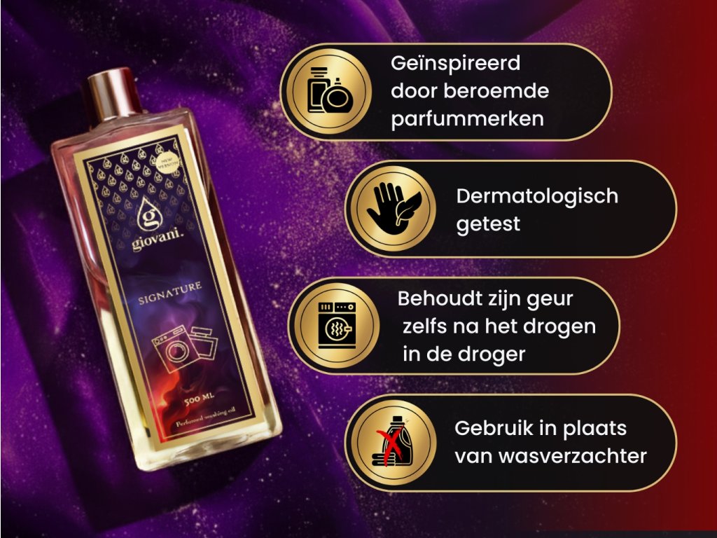 Plaats het parfum niet in de trommel van de wasmachine of in de droger. Ze zijn direct bedoeld voor gebruik in het wasverzachterbakje. Je hoeft je geen zorgen te maken dat je wasgoed zijn geur verliest na het drogen in de droger. Giovani® parfums zijn bestand tegen externe invloeden en duurzaam. Gewassen wasgoed zal zelfs na gebruik van de droger blijven ruiken. De optimale temperatuur voor het bewaren van wasoliën is ongeveer 15–25 graden Celsius.