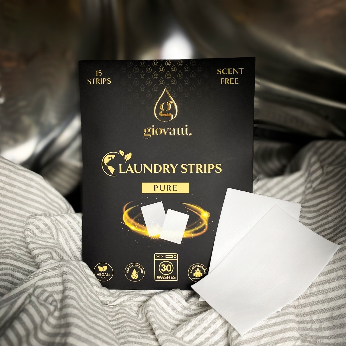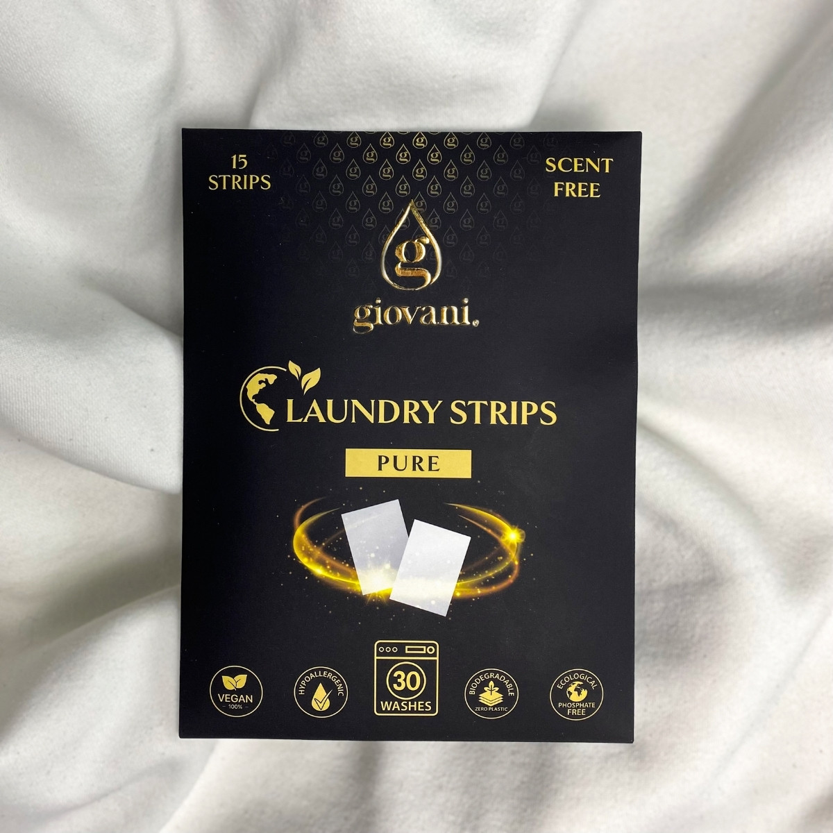 Ontdek het moderne alternatief voor traditionele wasmiddelen. Er zijn talloze voordelen waarom u de wasstrips Giovani® zou moeten gebruiken. Lees hieronder meer. Dit type PURE wasstrips bevat geen toegevoegde parfum en laat daardoor de intensiteit van onze wasparfums volledig tot hun recht komen, zonder enige interactie met hun aroma. Gebruik de wasstrip voor de zuiverheid van uw wasgoed en voeg een wasparfum toe als vervanging van wasverzachter voor perfect geurende was.